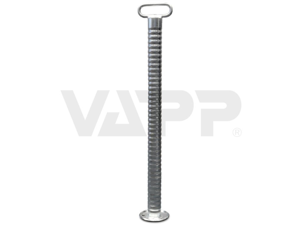 Opěrná noha k přívěsům s hrubým drážkováním proti prokluzu nohy v třmenovém držáku. Pro zajištění dostatečně pevného sevření nohy držákem a zamezení prokluzu nohy je nutné nohu upínat do příslušného litinového držáku, viz související produkty níže.