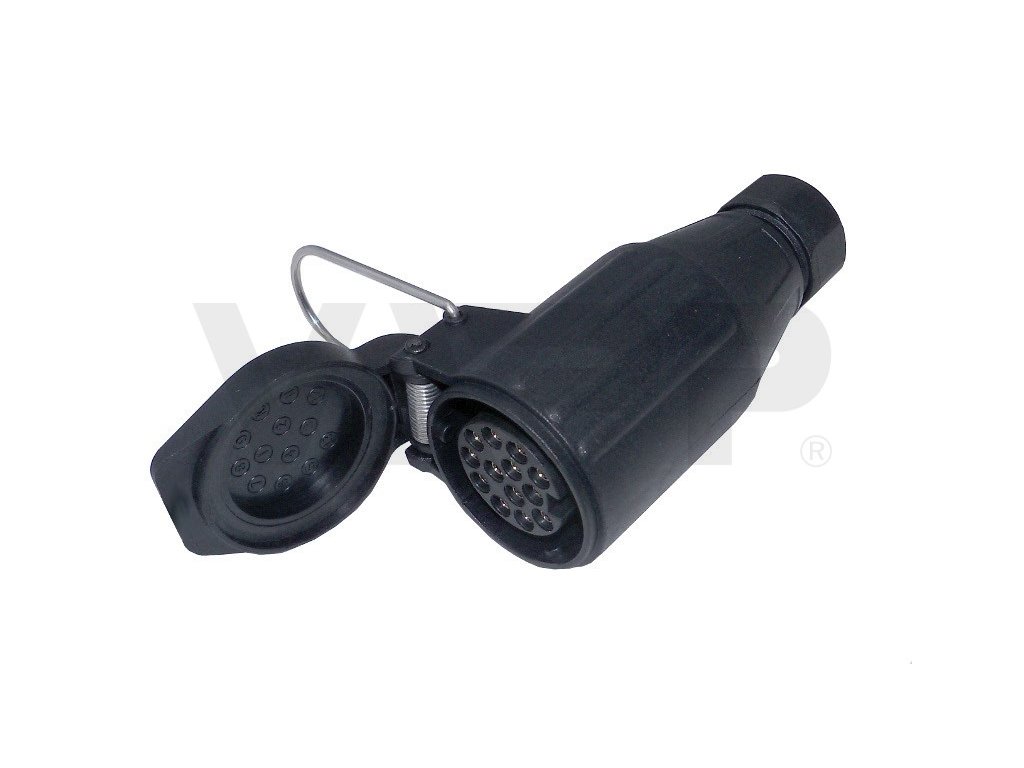 Na rozdíl od běžných třináctipólových zásuvek pro montáž na podkladovou plochu (např. plech u tažného zařízení) je tato kabelová zásuvka určená pro montáž na volný konec kabelu bez nutnosti podkladové plochy. Hodí se tak např. k výrobě různých prodlužovacích kabelů a redukcí. Kvalitní niklované piny a houževnatý plast zajistí dobré spojení a dlouhou životnost zásuvky. Víčko s těsnícím kroužkem a pružinou ochrání kontakty před znečištěním. Praktické kovové očko u pantu víčka dobře poslouží k zavěšení zásuvky. Jednotlivé kontakty zásuvky jsou číslované, vodiče se připojují přitažením pod šroubek. K připojení tak není potřeba žádné speciální nářadí.